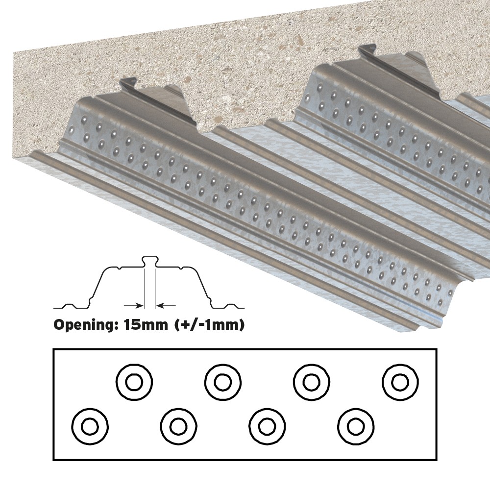 The Type COM is a high quality, cost effective decking fixing designed to fit inside the dovetail re-entrant channel of the ComFlor® 60 and ComFlor® 80 composite decking profiles manufactured by Tata Steel. The fixing comes in two parts (locking plate and wedge) and provides a zero-impact method of connection that avoids delamination and damage to the concrete deck. After the concrete deck has been poured and has reached full strength the Type COM is installed with an appropriate threaded rod from where building services can be easily and quickly suspended.