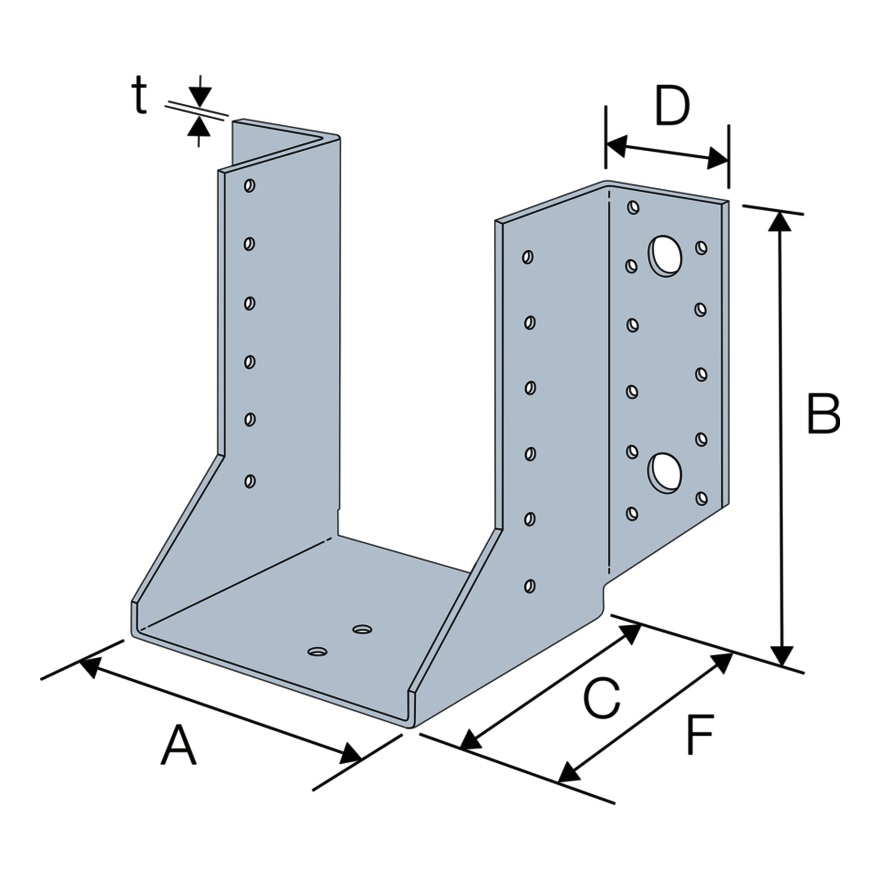 This hanger is uniquely versatile, featuring a combination of small holes for 3.75x30mm square twist nails and larger Ø11mm holes for M10 bolts or anchors, allowing it to be secured into timber, masonry, or steel headers.